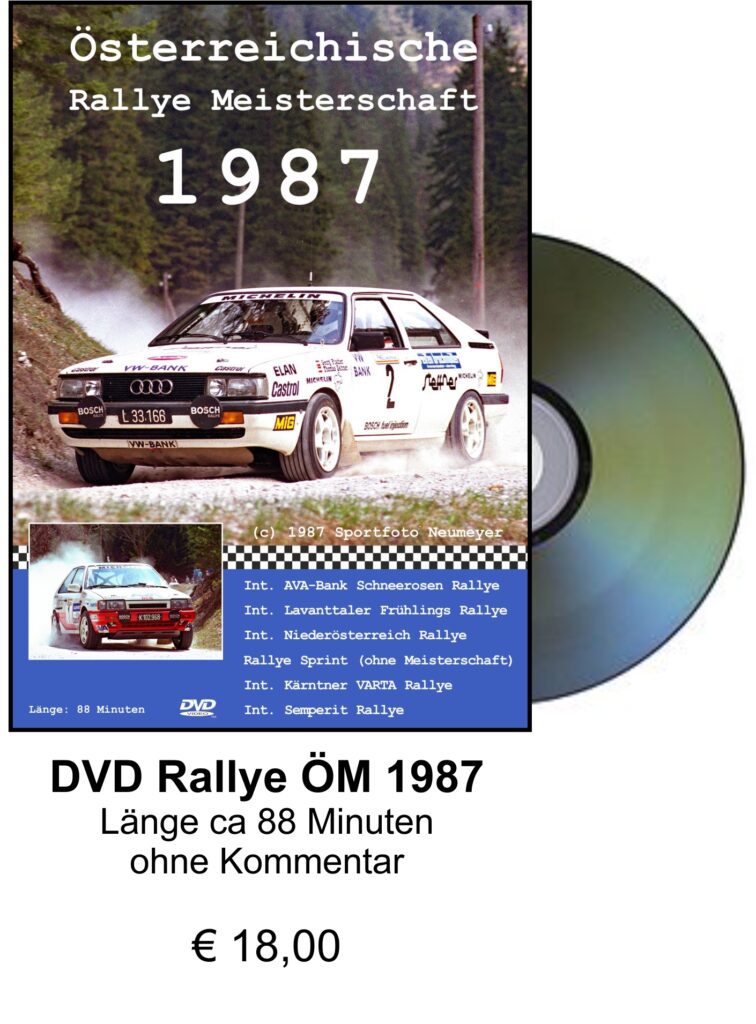Wir bieten auch fertige Zusammenschnitte der Rallye ÖM und Rallye EM von 1987 bis 2009 auf DVD an, hier eine kleine Auswahl der verfügbaren Artikel. Bestellung bzw Anfragen bitte per E-Mail unter rallyesport@a1.net